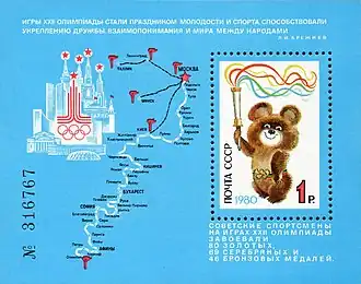 A Soviet stamp sheet showing the logo of the games and its mascot Misha holding the 1980 Olympic torch. The map shows the torch relay route from Olympia, Greece, the site of the ancient Olympic Games, to Moscow, Russian SFSR. It also depicts the number of gold, silver and bronze medals (80, 69, 46) won by the Soviet athletes at the Games.