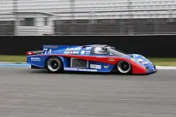 Jaguar Cars had been impressed with the strong effort in the past seasons by the American Group 44 Racing team of Bob Tullius. The company thought a full works effort was viable, but instead chose to ally with Tom Walkinshaw Racing - who had latterly been running the Jaguar XJ-S in the ETCC (European Touring Car Championship).[14][15] Designer Tony Southgate (who had worked with Shadow, Lotus and Theodore in F1) had produced the new XJR-6 model and it had run in the latter-half of last season. In the close-season, much work was done to simplify and lighten the key components.[14] The twin-valve 6.0-litre V12 engine had a single-overhead camshaft, with a 60 degree cylinder angle. TWR's engine-specialist, Allan Scott, could tune the engine to 630 bhp, with a top speed of 370 kp/h (230 mph).[14] It was fitted to a March-Hewland gearbox with the suspension running large 19" wheels, and the longtail body-styling gave it 70% more downforce than the Porsches.[8] The season drivers were current F1 drivers Eddie Cheever/Derek Warwick, and Jean-Louis Schlesser/Gianfranco Brancatelli (current ETCC champion). For Le Mans, Schlesser joined the first car, and TWR driver Win Percy joined Brancatelli in the second. A third car had former Group 44 teammates Brian Redman and Hurley Haywood, with Hans Heyer. The team had an excellent lead-up, with Warwick and Cheever winning the Silverstone round, and then Cheever throwing down the gauntlet to Porsche with the fastest times at the test-day.[16][8][15]