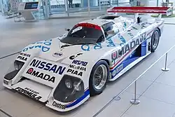 Nissan followed Mazda and Toyota into the broader Group C series. They had previously run cars in the home races at Fuji Speedway, and in September 1984 they set up NISMO, as a dedicated motorsport division in the company. Its initial thrust was into the IMSA competition with Nissan engines in March chassis. The VG30ET was a new development of the Nissan VG engine. A 3.0-litre V6 unit, with twin Garrett turbos, it could produce 700 bhp.[19][4] In a torrential downpour, Kazuyoshi Hoshino had won the Fuji 1000 the previous October with a March-Nissan 85G, beating the international teams. In December, NISMO ordered three further March chassis and got Gordon Coppuck to design the new car – the Nissan R86V, with the VG30 engine. One R86V came to Le Mans, for Hoshino, with single-seater drivers Aguri Suzuki and Keiji Matsumoto. They also sent an older R85V, for veteran drivers Masahiro Hasemi and Takao Wada. NISMO President Yasuharu Nanba came with orders for the cars to finish at all costs. March brought in Keith Greene as team manager and James Weaver for the Le Mans expertise.[19] With March now working with Nissan, it fell to privateers to represent the brand. English-based, Greek driver Costas Los had bought the March 84G from the Kreepy Krauly team, running it again in the C1 class. Meanwhile, Richard Cleare had bought an IMSA March 85G, fitted an older single-turbo Porsche engine, and entered it in the GTP class.[20][21] Mazdaspeed stepped up its racing program this year, moving from C2 into the IMSA GTP class. The new Mazda 757 was designed by Nigel Stroud on a honeycomb monocoque chassis and covered with a carbon-fibre/Kevlar bodyshell. It was planned to have a turbo-charged rotary engine, but until that was built, it was fitted with the new 13G, the first triple-rotor Wankel rotary. The three 654cc chambers were given the FIA equivalent of 3924cc and put out 450 bhp. This could get the cars up to 310 kp/h (195 mph). They were much lighter than all the C1 cars, even 40 kg lighter than the little WMs. Two cars came to Le Mans, along with a T-car. The Japanese works drivers returned (Terada, Yorino and Katayama). David Kennedy led the second car, this time joined by Pierre Dieudonné and Mark Galvin.[22]