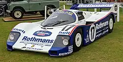 The race start reverted to 4pm and this year the honorary starter was Sir John Egan, chairman of Jaguar Cars.[44][42] At the start, both Ludwig and Boutsen tried to overtake the Rothmans Porsches and they raced four-wide down the main straight towards the Dunlop Curve. By the time they were at the Mulsanne corner, Ludwig and Warwick (in the Jaguar) were at the front. However, within three laps, the two works Porsches were up to speed and moved up to challenge the Joest car for the lead.[45][30][46] An early casualty was Raphanel in the Cougar, losing a door on the first lap. It cost 20 minutes in the pits to replace, only for it to happen again after only 3 laps back on the track. With no more doors left, the crew spent four hours fashioning a substitute out of a sheet of aluminium.[23][45] Another was Pescarolo in his Sauber, who stopped on the back straight. Debris had fallen off the sister-car he was following and holed the oil cooler. It took over an hour before he could limp back to the pits for repairs.[17][45] Worse, just a few laps later, the other Sauber pitted with handling problems.[45] This continued into the second hour, after the first pit-stops with the co-drivers taking up the pursuit. After that first hour, there were nine cars on the lead lap; after two, it was down to five: the Joest car was still less than 30 seconds ahead of two of the works Porsches, with the two Jaguars of Warwick/Cheever/Schlesser and Brancatelli/Percy/Hahne not far behind, looking solid. A lap down were the third works cars, the Larrauri and Boutsen Brun cars, and the Gartner/van der Merwe Kremer car in 10th.[47][30] After initially leading in C2, the Spice-Fiero had slipped back when its clutch problems resurfaced.[27] The class was now being led by Dickens' Gebhardt. They held the lead until 8pm when a collision with a C1 car forced a half-hour in the pits to repair the suspension, only to crash at the Ford Chicane soon after returning to the race.[31] The ADA Gebhardt had a tyre blowout at Indianapolis that ripped up the rear bodywork, and required a new wing to be improvised and riveted into place.[31] The leaders kept up their pace going into dusk, while the field behind had their issues. The first leader change was after six hours, as the Joest car slipped to third behind the Rothmans cars.[30][7] Both works teams lost a car in the early hours. The experimental Porsche broke its gearbox after Olson had a big moment at Indianapolis while running 7th.[6] The Jaguar of Hans Heyer stopped at Indianapolis, apparently out of fuel. He contrived to get back to the pits, swerving back and forth to pick up any remaining fuel, where it was found the fuel pump had failed. Schuppan, now at a loose end, was transferred to Mass' Porsche, and likewise Haywood moved to the Brancatelli car (that had inherited the sister car's fifth place) to help with the driving.[6][16][47][30] Miller stopped the American Joest car at Mulsanne, also apparently out of fuel. Pushed behind the walls, it re-appeared five minutes later when he was able to switch it over to the reserve tank and get back to the pits. The time lost dropped them from tenth to 21st.[7] The 7th hour was tough on the Brun team, with the team-owner at the wheel when his car lost a valve, while running 11th; and then Alain Ferté lost control of his at the Ford Chicane, slamming into the wall.[9][47]
