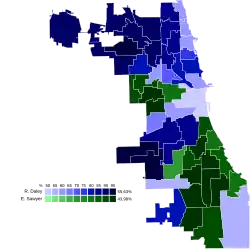 Daley won a majority of the vote in 31 of the city's 50 wards, with Sawyer winning a majority of the vote in the remaining 19 wards.[26]