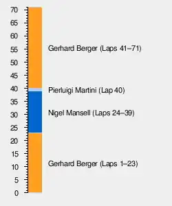 Berger had a great start and managed to overtake Senna. Mansell was in third followed by Prost, Martini and Patrese. Berger quickly opened a lead while Senna was trying to keep Mansell behind. Then Mansell finally managed to overtake Senna and started to catch Berger. As the two Ferraris caught up with the slower cars and were starting to lap them, Mansell managed to overtake Berger. Positions at lap 24 were: Mansell, Berger, Senna and Prost. Prost was the first of the leaders to pit for new tyres from fourth position. He was quickly followed by Berger on lap 35 and then by Senna. Then came the crucial moment of the race. Mansell came into the pits slightly too fast, locked his tyres and missed his pit box by a few metres. Although his pit crew moved down the pit lane to try to change his tyres where he had stopped, Mansell engaged reverse gear and drove backwards the short distance into the correct spot, despite the Ferrari mechanics signalling to him to not reverse the car. After the leaders went to pit for tyres, Martini led a lap in the Minardi, the only time in F1 history that a Minardi car was at the front leading. Mansell was down in fourth. Berger, Senna and Mansell quickly overtook Martini and Mansell closed on Senna. However, as driving a car in reverse in the pit lane was expressly forbidden (the pit crew may legally push a car backwards), Mansell was given the black disqualification flag. At the start of lap 48, approaching Turn 1 even while the black flag was being waved at him Mansell tried to overtake Senna, the cars collided and both drivers were out. This damaged Senna's title chances, especially since rival Alain Prost came in second place. The race was won by Berger ahead of Prost, with Stefan Johansson a surprising third in the underfunded Onyx; the Swede did not make a pit-stop at any stage of the race and was initially on course for fifth place until both Williams-Renault entries were pulled out with overheating issues. It turned out to be Johansson's final career podium.
