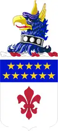 The shield is white, the old color of Infantry. The eleven mullets represent the eleven battles and campaigns in which the organization served during the Civil War, and the red fleur-de-lis is for World War I service. The red is also the color of the Coast Artillery.
