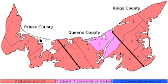 ![]() Map of PEI's ridings coloured in based on how they voted | |||||||||||||||||||||||||||||||||||||
