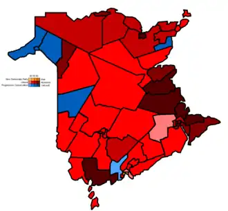 Map of New Brunswick's ridings coloured in based on the winning parties and their popular vote  | |||||||||||||||||||||||||||||||||||||||||||||||||||||||||||||||||||||||||||||