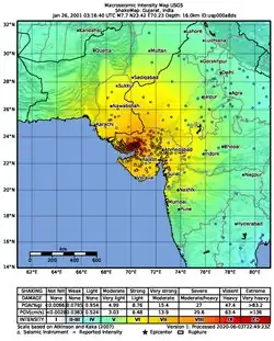 The 2001 Gujarat earthquake, also known as the Bhuj earthquake, occurred on 26 January at 08:46 am IST. The epicentre was about 9 km south-southwest of the village of Chobari in Bhachau Taluka of Kutch district in Gujarat, India.[2][3] The earthquake had a maximum Mercalli intensity of XII (Extreme).[4]