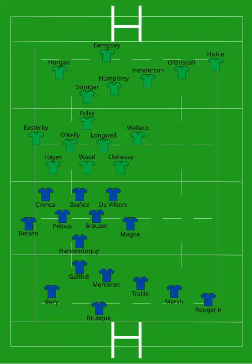 | Try: Kelly (2) 38' c, 47' m Hickie 75' m Con: O'Gara 39' Pen: Humphreys (4) 4', 11', 16', 60' O'Gara 40' | Report | Try: Ma. Bergamasco 53' c De Carli 79' c Con: Dominguez (2) 54', 80' Pen: Peens 43' |