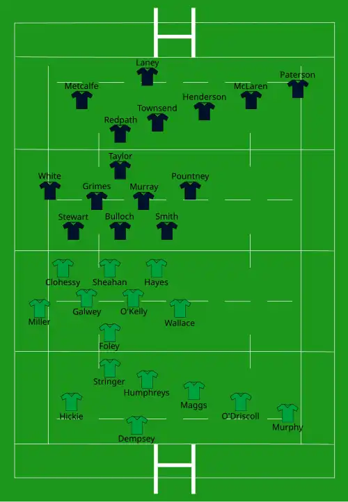 | Try: Murphy (2) 3' c, 47' c O'Connell 21' m Hickie 70' m Gleeson 72' c O'Gara 76' m Con: Humphreys (2) 4', 47' O'Gara 73' Pen: Humphreys (6) 9', 16', 30', 36', 52', 56' | Report | Try: S. Jones 61' c Con: S. Jones 62' Pen: S. Jones 40' |