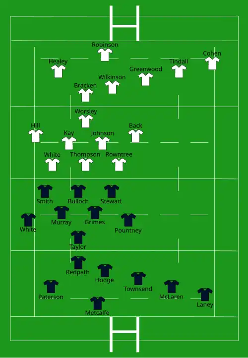 | Try: Redpath 53' c Con: Laney 54' Pen: Laney 7' | Report | Try: Marsh (2) 16' c, 41' m Galthié 46' c Con: Merceron (2) 17', 47' Pen: Merceron 29' |