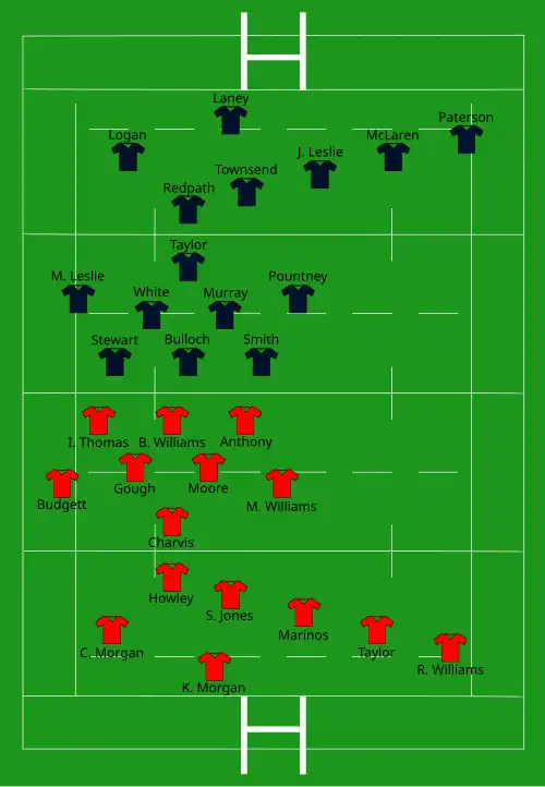 | Try: R. Williams 45' c Con: S. Jones 46' Pen: S. Jones (5) 8', 14', 16', 62', 78' | Report | Try: Bulloch (2) 18' m, 28' c Con: Laney 30' Pen: Laney (4) 40', 59', 75', 79' Hodge 79' |