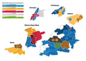 ![]() Map of the results of the 2003 North Somerset council election. Conservatives in blue, independent in grey, Liberal Democrats in yellow, Labour in red and Green Party in green. | ||||||||||||||||||||||||||||||||||||||||||||||||||||||||||||||||||||