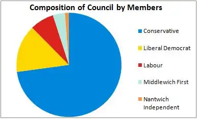 At the 2005 Cheshire County Council election, there were 15 Conservative controlled wards, 6 Labour controlled wards, 5 Liberal Democrat controlled wards and 1 ward controlled by an independent. Based on the 2005 results, the Cheshire East Council election would have resulted in 45 Conservative councillors, 18 Labour councillors, 15 Liberal Democrat councillors and 3 independents; the projected results would have given the Conservatives overall control of the council, with a majority of 9 councillors.