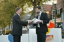The closing ceremony started with the Vintage InterPares race in the 12’ Dinghies. This was followed by the prize giving. The prizes were handed out by the representatives of the International Class Organizations. During the closing of the event Rudy den Outer thanked the city of Medemblik for her cooperation. He also announced that “Multilario”, will be the host of the 2012 Vintage Yachting Games. After that the Vintage flag was received from the mayor of Medemblik, Theo van Eijk[2] by the Project manager of the 2012 Edition of the Vintage Yachting Games: Pietro Adamoli. This next edition will be organized at Lake Como.