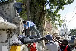 Rescue efforts began in the immediate aftermath of the earthquake, with able-bodied survivors extricating the living and the dead from the rubble of the many buildings that had collapsed.[157] Treatment of the injured was hampered by the lack of hospital and morgue facilities: the Argentine military field hospital, which had been serving MINUSTAH, was the only one available until 13 January.[158] Rescue work intensified only slightly with the arrival of doctors, police officers, military personnel and firefighters from various countries two days after the earthquake.[159]