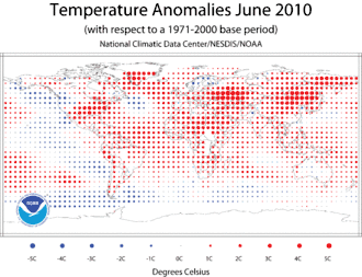 ![]() A map of the above-average temperatures, caused by the global heat waves, in June 2010. | |