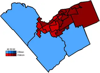 Watson won nearly half of the votes. His strongest wards were in the city's East end, despite having never represented the area (except as mayor). His highest vote percentage was in Rideau-Vanier Ward. Watson's worst wards were the three rural wards which were the only three wards he lost. His worst ward was West Carleton-March Ward.