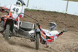 The Sidecarcross World Championship, first held in 1980 and organised by the Fédération Internationale de Motocyclisme, is an annual competition. All races, manufacturers and the vast majority of riders in the competition being in and from Europe.[1][7] Sidecarcross is similar to motocross except that the teams consist of two riders, a driver and a passenger. Races are held on the same tracks as solo motocross but the handling of the machines differs as sidecars don't lean. The majority of physical work in the sport is carried out by the passenger, who speeds up the sidecarcross in corners by leaning out. The coordination between the driver and the passenger are therefore of highest importance.[8]