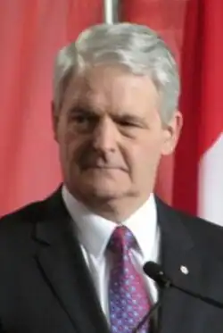 In the case of a vacancy in the leadership, the Board is required to meet to appoint an interim leader "in consultation" with the parliamentary caucus, i.e., its 34 MPs and 46 senators.[5] Before this meeting, the Board determined it would not consider anyone unless that person has the support of a majority of MPs and of the caucus as a whole, was bilingual, and promised in writing not to seek the permanent leadership and not to discuss or negotiate significant changes to the party, which would include a merger with the New Democratic Party (NDP). This was taken as intended to exclude Bob Rae a potential leadership candidate who had significant support among Liberal senators and had talked about a merger shortly after the general election loss, as well as Deputy Leader Ralph Goodale, who is not bilingual, and any other MP who may intend to run in the leadership campaign.[9][10] Nonetheless, after the caucus discussed the interim leadership on May 11, 2011, it met again on May 25 and voted to recommend Rae as interim leader over Marc Garneau; the Board subsequently confirmed the appointment.[11][12][13] Rumoured candidates who did not run for interim leader included Goodale, Carolyn Bennett, Scott Brison, and John McCallum.[14]
