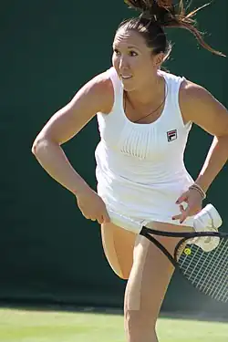 Nadia Petrova & Katarina Srebotnik reached six finals in 2013 and claimed half of them. They reached their first final of the year at the Apia International Sydney defeating top seeds Errani & Vinci.[82] They then reached back-to-back finals at the Qatar Total Open and Dubai Tennis Championships but fell in both in a match tie-break losing to Errani & Vinci and to Mattek-Sands & Mirza.[85][92] They reached back-to-back finals again, but with mixed results, losing in the final of the BNP Paribas Open to Makarova & Vesnina and won at the Sony Open Tennis defeating Raymond & Robson.[93][94] They claimed their third title defeating Niculescu & Zakopalová in the final.[95] Srebotnik also partnered with Jelena Janković to win the Rogers Cup over Grönefeld & Peschke.[96] Srebotnik then reached the final of New Haven Open at Yale with Anabel Medina Garrigues losing to Mirza & Zheng.[97]