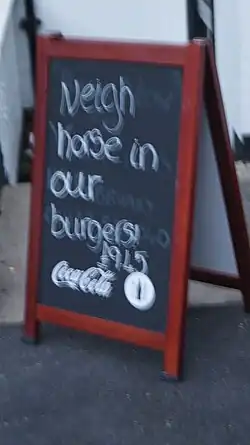 "Neigh horse in our burgers", a satire on the scandal outside a pub in Wetherby, West Yorkshire