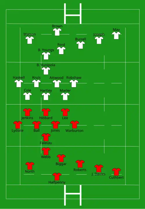 | Try: Webb 7' c Con: Halfpenny (1/1) 8' Pen: Halfpenny (2/3) 1', 23' Drop: Biggar (1/1) 40' | Report | Try: Watson 14' m Joseph 43' c Con: Ford (1/2) 45' Pen: Ford (3/4) 31', 61', 78' |