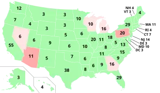 The United States Electoral College is the group of presidential electors required by the Constitution to form every four years for the sole purpose of electing the president and vice president. Each state appoints electors according to its legislature, equal in number to its congressional delegation (senators and representatives). Federal office holders cannot be electors. Of the current 538 electors, an absolute majority of 270 or more electoral votes is required to elect the president and vice president.[1] As stated in the Twelfth Amendment to the United States Constitution, if no candidate for either office achieves an absolute majority there, a contingent election is held by the United States House of Representatives to elect the president, and by the United States Senate to elect the vice president; under this amendment, only the election of 1824 failed to produce a majority for president, and the election of 1836 for vice president.