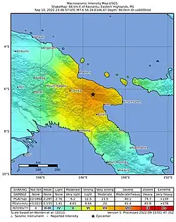 This article incorporates text from this source, which is in the public domain: "M 7.6 – 67 km E of Kainantu, Papua New Guinea". United States Geological Survey. 10 September 2022. Archived from the original on 11 September 2022. Retrieved 11 September 2022. - ^ Patrick Meunier; Niels Hovius; John Allan Haines (2008). "Topographic site effects and the location of earthquake-induced landslides" (PDF). Earth and Planetary Science Letters. 275 (3–4). Elsevier: 221–232. Bibcode:2008E&PSL.275..221M. doi:10.1016/j.epsl.2008.07.020. Archived (PDF) from the original on 29 June 2022. Retrieved 13 September 2022.