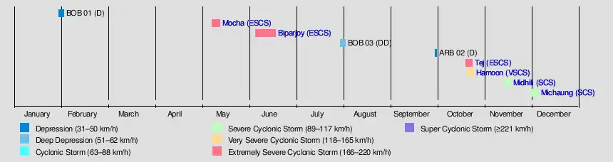 The 2023 North Indian Ocean cyclone season was an above-average and deadly season, becoming the most active since 2019, with nine depressions and six cyclonic storms forming. It was the deadliest since 2017, mostly due to Cyclone Mocha, and had the second-highest accumulated cyclone energy (ACE) in the basin, after the 2019 cyclone season, which was itself the second most active North Indian Ocean cyclone season on record in terms of cyclonic storms.[1] The 2023 season also had the most extremely severe cyclonic storms on record, tying with 1999 and 2019. The North Indian Ocean cyclone season has no official bounds, but cyclones tend to form between April and December, with the peak from May to November. These dates conventionally delimit the period of each year when most tropical cyclones form in the northern Indian Ocean. However, a cyclone can form at any time during the year shown by an unnamed depression that affected Sri Lanka in January–February.