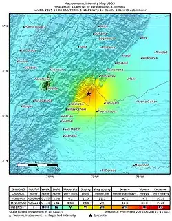- ^ a b "Temblor en Colombia | Meta y Cundinamarca tienen graves afectaciones: daños en el 90% de viviendas de Santa Cecilia" (in Spanish). El Tiempo. 9 June 2025. Retrieved 9 June 2025.