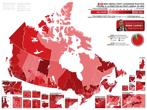 Mark Carney, the former governor of the Bank of Canada, won the ranked-choice voting (RCV) election with over 85% of the first-preference vote and points, as well as a majority in all 343 ridings.[13][14] This margin of victory surpassed Justin Trudeau's 2013 leadership victory margin in vote share, points, and ridings.[13]