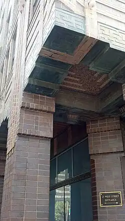 The facade of 21 West Street was designed with molded and oversized brick "to emphasize the structural lines and to enrich the texture of the materials".[4] Red, orange, yellow, and purple brick and terracotta were used.[16][18] The polychrome design was influenced by Harvey Wiley Corbett's plan for the Master Apartments on the Upper West Side of Manhattan.[15] For instance, the light-tan vertical piers highlight the building's vertical dimension, while other brick patterns give the impression of a "skin", including the horizontal lines of the spandrels between the floors.[19] At each setback and on the three lower levels, the parapets have various designs of molded brick to provide surface texture to the building's exterior.[11] The southern facade is hidden behind the Downtown Athletic Club building to the south.[12][20]