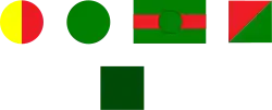 ![]() | From left to right, top row: 11th West Yorkshire Regiment, 8th, 9th Yorkshire Regiment (Green Howards), 10th Duke of Wellington's. Bottom row: 69th Machine gun Company. Except the MG company which wore its patches on both sleeves, all were worn on the back. In Italy the 11th West Yorks and the 8th Green Howards used the patch as a pargi flash on pith helmets, and the 10th Duke of Wellingtons stencilled a silhouette of the regimental badge on their helmets.[75] |