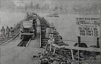 ![]() This 1032 foot long treadway bridge was the first tactical bridge built across the Rhine River completed on 10 March 1945. It was constructed under heavy enemy fire in 32 hours about 400 meters downstream from the Ludendorff Bridge during the Battle of Remagen. | |