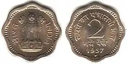 ![]() | 2 naye paise | 2.95 g | 18 mm | 1.8 mm | Cupronickel | Smooth | State Emblem of India & country name in Hindi and English. | Face-value and year. | 1957 | 1964 | Demonetized.[1] | |