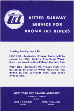 - ^ Friedlander, Alex; Lonto, Arthur; Raudenbush, Henry (April 1960). "A Summary of Services on the IRT Division, NYCTA" (PDF). New York Division Bulletin. 3 (1). Electric Railroaders' Association: 2–3. Archived from the original (PDF) on September 14, 2020. Retrieved January 7, 2022.