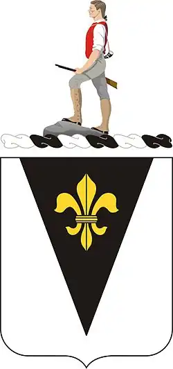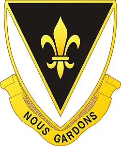 - Symbolism: White is the old Infantry color; the black pile is the background of the shoulder sleeve insignia of the 83d Division and the gold fleur-de-lis indicates the organization’s service in France. The motto translates to "We Guard."