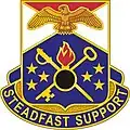 The Distinctive Unit Insignia is a shield with a gold eagle in the top section. The background is a white X shape over red and blue sections. The blue contains a bursting bomb with crossed key and sword behind it and three stars on either side. Below is a scroll with the motto "Steadfast Support."[2]