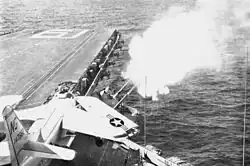 Two of the eight turrets of the carrier USS Ranger firing, in 1961.