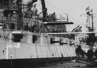 ![]() USS Minnesota (BB-22), cropped photo showing close up of port side 7"/45 caliber guns. | |