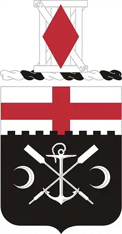 - Symbolism - Shield- Black and white were the old colors of the Engineer Corps. The anchor and oars device was the badge of the Engineers and Pontoniers of the Army of the Potomac where the old units of the regiment did such gallant service. The crescents are the device of General Winfield Scott and represent the service of the old company in 1846–1848 in the Mexican War. In France, the regiment served with great gallantry in the 5th Division. The crossing of the Meuse near Dun is indicated by the device in chief of the shield which is not only a cross for the crossing of the river but the device of the lords of Dun.