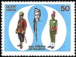 The Jat Regiment also known as The Royal Jats is an infantry regiment of the Indian Army, of which it is one of the longest-serving and most decorated regiments.[2] The regiment has won 19 Battle Honours between 1839 and 1947,[3] and post-independence it has won Five Battle Honours, including 3 Ashok Chakra, 2 Victoria Cross, 2 George Cross, 13 Kirti Chakra, 8 Mahavir Chakra, 3 Military Medal, 53 Shaurya Chakras, 39 Vir Chakras and 343 Sena Medals.[2][4] During its 200-year service history, the regiment has participated in various actions and operations in India and abroad, including the First and the Second World Wars. Numerous battalions of the Jat Regiment, including the 14th Murray's Jat Lancers, fought in the First World War.[5]