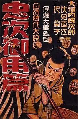 A Diary of Chuji's Travels (Japanese: 忠次旅日記, Hepburn: Chūji Tabi Nikki) is a silent Japanese jidaigeki made in 1927 starring Denjirō Ōkōchi and directed by Daisuke Itō. It was originally released in three parts, all of which were long thought to be lost until portions of the second part and much of the third part were discovered and restored in 1991.[1] Since the film had once been voted in a 1959 Kinema Junpō poll as the best Japanese film of all time, its discovery was significant.[1] At the time of its release, Itō was the leader of a new style of samurai films that featured outlaw heroes and fast-cut sword fighting scenes.