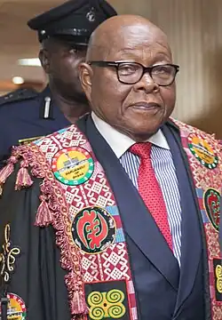 Aaron Mike Oquaye (born 4 April 1944) is a Ghanaian barrister and politician who served as the sixth Speaker of Parliament of the Fourth Republic of Ghana from 2017 to 2021.[1][2] An academic, diplomat and Baptist minister, he previously held the cabinet ministerial portfolios for energy and communication and was also the High Commissioner of Ghana to India (2002–04) in the Kufuor administration.[3]