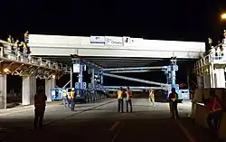 MTO retained the engineering and management firm Morrison Hershfield as lead consultant for this exciting and innovative project.[5] The rapid bridge replacement process began the evening of July 30, 2010. Using innovative technology the old bridge was lifted away and replaced with a pre-constructed bridge that was built nearby. The process was completed on August 3, 2010.[6] Dufferin Construction Company successfully executed the complete replacement.[7]