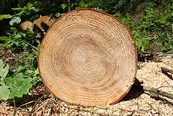 Specimens have historically been able to live up to nearly 300 years, but in modern stressed conditions, 100 years is more typical.[4] A number of defoliating insects threaten the tree; in the late 20th century, western spruce budworm epidemics killed sizable populations of grand fir in the eastern Cascades and Blue Mountains.[4] The lack of an ability to use pitch to patch wounds, including those from logging and small fires, provides a weakness exploited by rot fungi.[4] East of the Cascade ridge, grand fir trunks are infected by Indian paint fungus, indicating a rotten core; such specimens are often waterlogged and thus crack apart in freezing weather.[4]