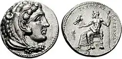 After his conquest of the Achaemenid Empire, Alexander the Great established his own satraps in the conquered territories, some of them Achaemenids who had been favorable to the invader, such as Mazaios, others some of Alexander's closest supports, such as Balacrus. Several satraps continued to use an Achaemenid type for their coinage, such as Balacrus when he became Hellenistic satrap of Cilicia, complete with the local deity of Tarsus, Baal.[61] This coinage is said to have later influenced Alexander's imperial coinage, which was often minted in the same mints.[61]