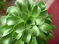 Aeonium glutinosum is a species of flowering plant in the family Crassulaceae endemic to Madeira, Portugal. It has fairly thick leaves and its appearance varies depending on its growing conditions. One characteristic is the very sticky stem of the inflorescence. The main flower is shown but small stalks with flowers continue to appear for several months.
