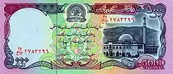 | Afs. 5,000 | 165 × 74 mm | Purple | Seal of Da Afghanistan Bank, Pul-e Khishti Mosque | Tomb of Ahmad Shah Durrani | |