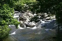 The Ogwen emerging at the western end of Llyn Ogwen immediately descends cataracts and waterfalls, known as Ogwen Falls in English and Rhaeadr Ogwen in Welsh, before continuing in a north-north-westerly direction down the glaciated Nant Ffrancon valley.