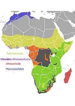 | Red: Afrosoricida, yellow: Tubulidentata, blue: Macroscelidea, orange: both Macroscelidea and Afrosoricida, green: both Macroscelidea and Tubulidentata, purple: both Macroscelidea and Afrosoricida, black: Tubulidentata, Afrosoricida and Macroscelidea | |